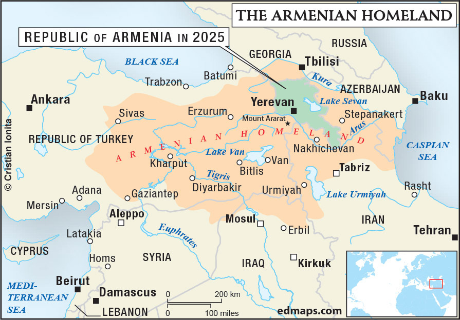 The present-day Republic of Armenia represents only a small part of the traditional Armenian homeland. According to the Armenian historians, this traditional homeland occupied from the beginning of the nation’s history the so-called Armenian Highlands (located in the southern part of the Caucasus region and the eastern part of the Anatolian peninsula) and the adjacent regions.
