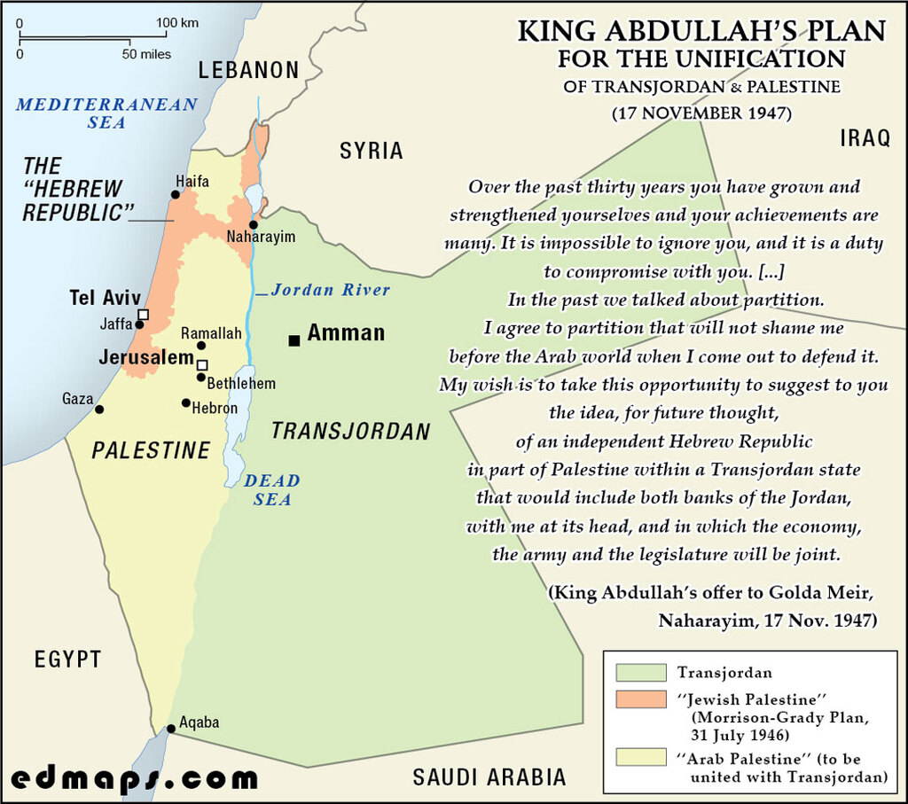 In 1947, King Abdullah I proposed annexing Arab Palestine to Transjordan, offering Jewish autonomy within an enlarged kingdom, rejected by Zionists seeking an independent state.