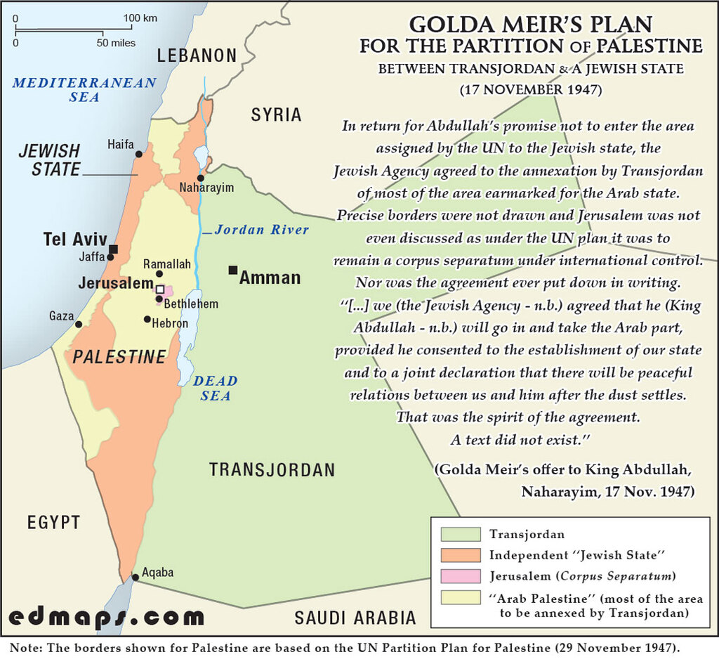 Golda Meir, representing the Jewish Agency, supported the UN Partition Plan (1947), advocating for an independent Jewish state alongside an Arab state in Palestine and Transjordan.