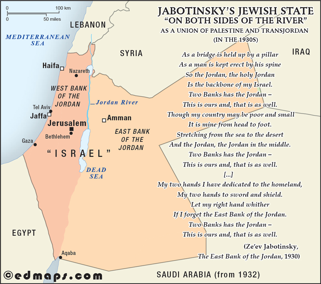 In the 1930s, Jabotinsky envisioned a Jewish state spanning both banks of the Jordan River, encompassing Palestine and Transjordan.