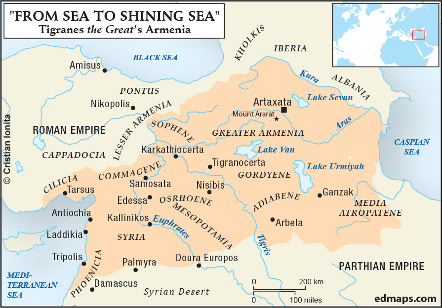 For Armenia, this Golden Age seems to be, territorially speaking, the reign of the king Tigranes the Great (95-55 BC). At its zenith, Tigranes’ Armenia was extended outside of the Armenian Highlands over the regions that are now southeastern Turkey, Lebanon, northern Syria and Iraq, and northwestern Iran.