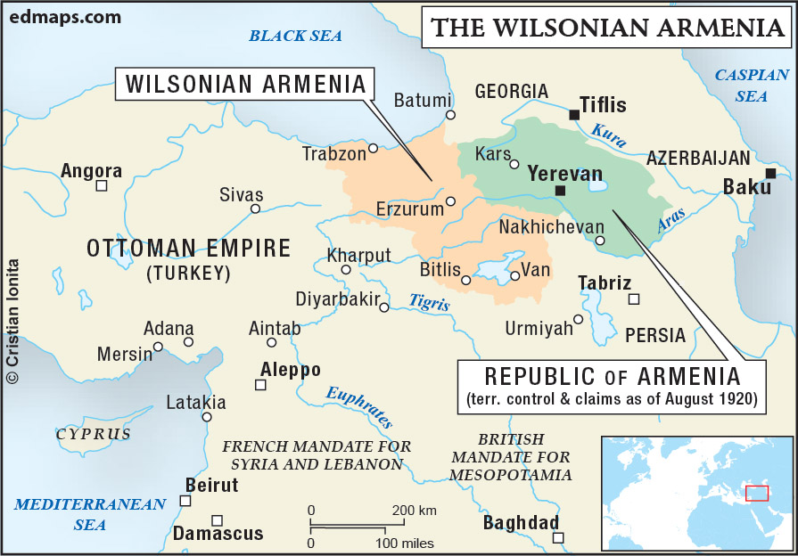 The Armenians’ claims have been rejected by the Great Powers, but the idea of a large Armenian state had its supporters: Woodrow Wilson, the American president, proposed a new western boundary for this Armenian republic (Treaty of Sèvres, 1920). According to Wilson, the Republic of Armenia had to annex the so-called Western Armenia (known later as "Wilsonian Armenia"), namely the Ottoman vilayets of Erzurum, Bitlis, and Van, and the Pontic coast with the port of Trabzon.
