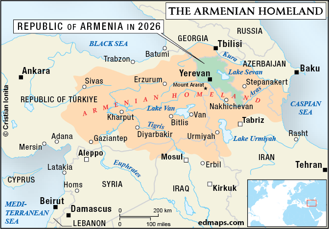 The present-day Republic of Armenia represents only a small part of the traditional Armenian homeland. According to the Armenian historians, this traditional homeland occupied from the beginning of the nation’s history the so-called Armenian Highlands (located in the southern part of the Caucasus region and the eastern part of the Anatolian peninsula) and the adjacent regions.