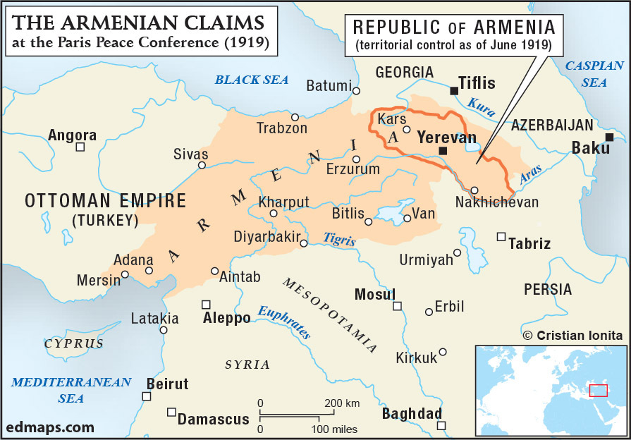 In this context, in 1919, at the Paris Peace Conference, the Armenian political elite claimed, after the creation of a small Armenian republic in Eastern Armenia (former Russian-controlled Armenia), sovereignty over all of the Armenian lands and the establishment of an independent and united Armenian state "from sea to sea."