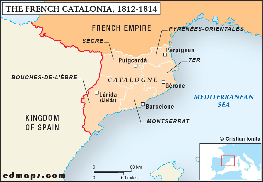 A century later, the situation would radically change again, after the French conquest of Spain. In 1812, the territories of the ancient Carolingian Catalan counties were annexed by the French Empire. After this short-lived and ambiguous initiative, Catalonia became Spanish again in 1814...