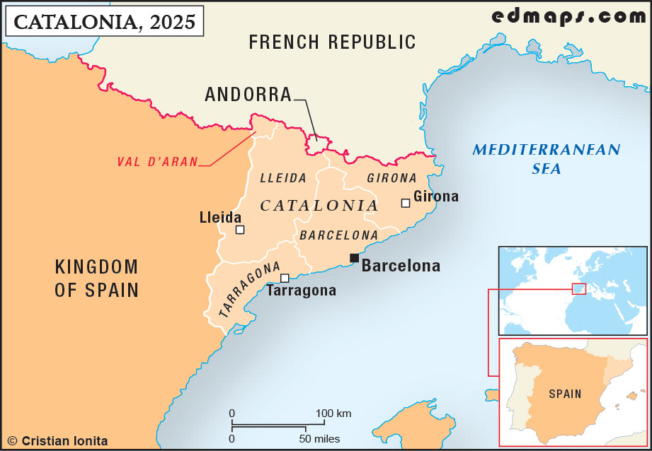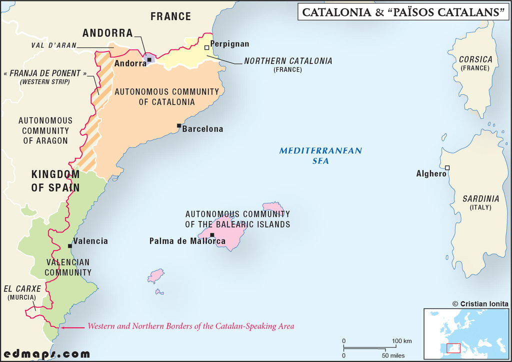 According to the Catalan nationalists, the Autonomous Community of Catalonia (often identified as “the Principality” in the nationalist discourse) represents only one of the Catalan lands or countries (Països Catalans). Technically, this term, Països Catalans, refers to all the territories where the Catalan language is spoken: Northern Catalonia (France), the Principality of Andorra, the Autonomous Community of Catalonia (without the Occitan-speaking area of Val d’Aran), Eastern Aragon (Franja de Ponent), the Eastern part of the Valencian Community, the small region of El Carxe (Murcia), the Balearic Islands, and the Italian town of Alghero (Sardinia). In other words, if the project of Catalonia’s secession is already a nightmare for the Spanish establishment, a union of all Catalan countries would certainly be an apocalyptic scenario for Madrid...