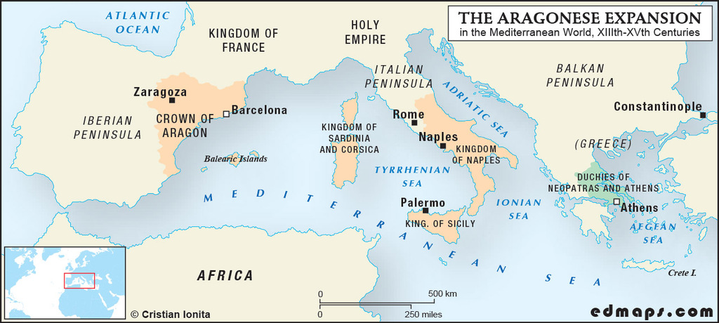 The Aragonese (and Catalan) expansion across the sea was not limited to the Balearic Islands. In competition with the French Angevins, the Aragonese warriors conquered Sicily in 1282, and Peter the Great, King of Aragon and Valencia and Count of Barcelona, became King of Sicily. In 1297, James II, King of Aragon, Valencia, and Sicily and Count of Barcelona, was granted the Kingdom of Sardinia and Corsica. (The presence of a Catalan-speaking community in Sardinia is historically associated with this Aragonese rule.) In the Balkan Peninsula, in 1312, the Catalan lords of the duchies of Neopatras and Athens recognized the Aragonese-Sicilian suzerainty (until 1388). Later, in the Italian Peninsula, the Kingdom of Naples is added too to the House of Aragon (between 1442 and 1714). At the end of the 15th century, Aragon was certainly a major power in the Mediterranean.