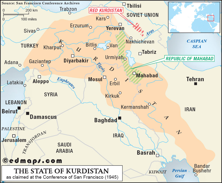 After the territorial fiasco of the 1920s and 1930s, a new Kurdish nationalist’s conception of a viable Kurdish state has been presented to the first session of the United Nations at the San Francisco Conference (1945). According to the Kurdish petition, Kurdistan stretched from the Mediterranean Sea to the Persian Gulf and included the predominantly Kurdish territory of the Turkish Eastern Anatolia, the Iraqi region of Mosul, and Western Iran. In addition, there were also some smaller Syrian, Armenian, and Azeri territories to be annexed to the Kurdish state. If these demands had some rational arguments, the surprise was the Kurdish claim to the non-Kurdish Iranian region, which had to offer an access to the Persian Gulf.