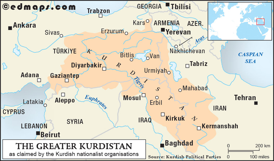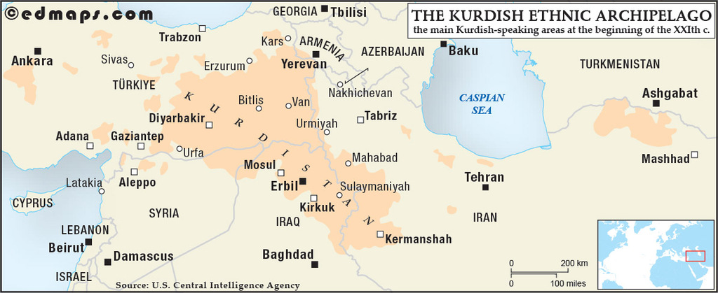 After WWII, the Kurdish nationalist organizations changed their major objective, and, with regard to Kurdistan’s territory, they opted for a less objectionable frontier. In order to reduce the possibility of a major conflict with other nationalist movements, the State of Kurdistan had only to incorporate the predominantly Kurdish regions of the Turkish Eastern Anatolia, the Northern Syria, the Iraqi Kurdistan, and the Iranian Kurdistan, with access to the Mediterranean Sea.